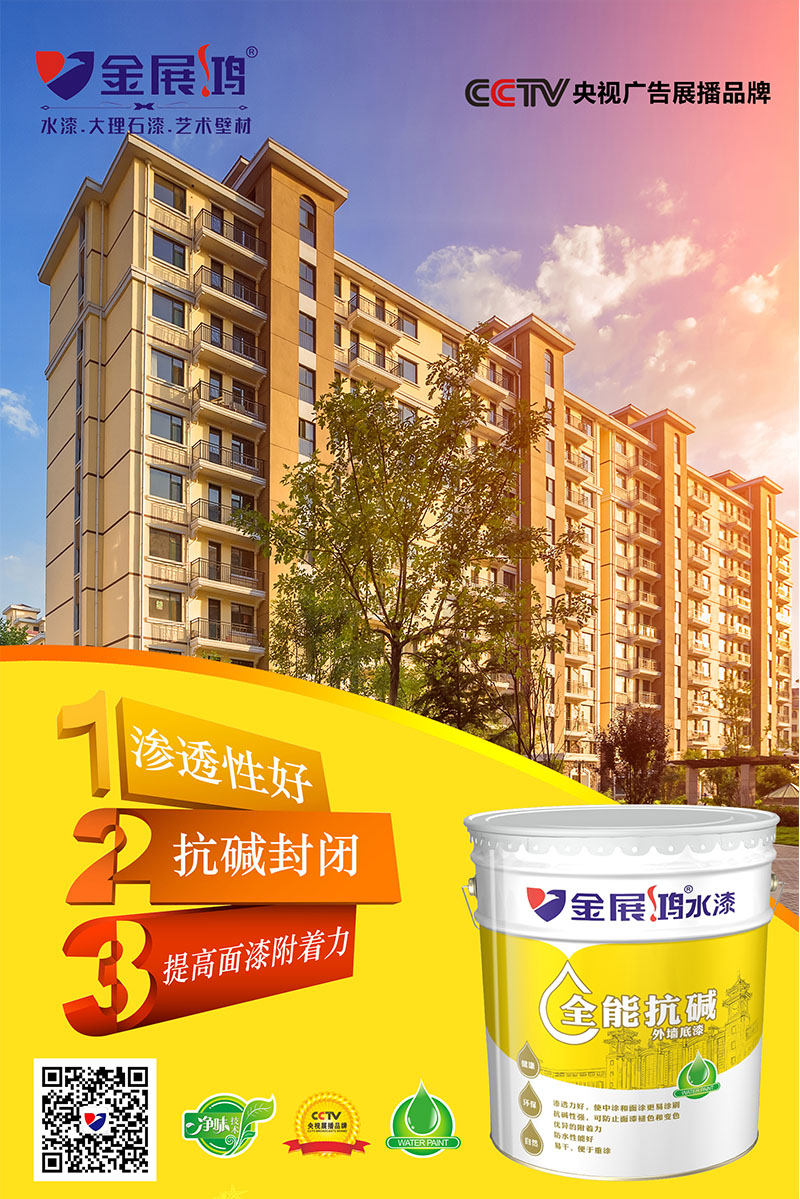 金展鸿全能抗碱外墙底漆适用于水泥结构,砖石结构墙体表面专用底漆,它的高密度胶合剂含量使其具有超强的附着力,具有高性能型抗碱封闭功效,漆膜附着力强,使墙体与面漆达到完美的结合,可彻底封闭墙体,防止墙体碱份渗出;有效防止霉菌、藻类的攻击;具有优异的耐水性和良好的抗碱性,超强的抗老化性,可有效延长面漆使用寿命。